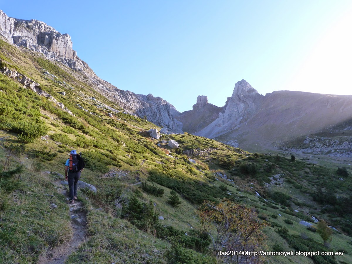 hacia el fondo del valle. El sol se va poniendo y las cimas de la Bal d’Aisa